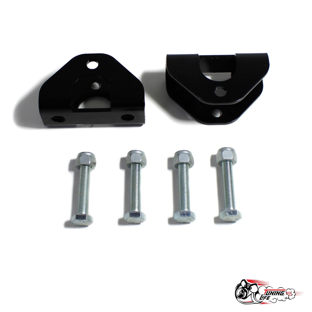 Модернизированная конструкция кронштейна позволяет остаться на штатных амортизаторах при лифте автомобиля пружинами +2″. Компенсация хода амортизатора происходит за счет перенеса его нижней точки крепления.