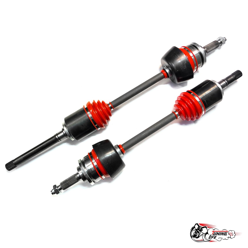Конструкция данных приводов включает в себя: внешний шрус (заводской, оригинальный) + вал привода "спорт", изготовленный из торсионной стали 30ХГСА + внутренняя граната трипоидного типа. Внутри конструкции трипода имеется специальная трехпалая крестовина с подшипниками на концах. И все это установлено в толстостенный стакан. За счет своей конструкции внутренний шарнир выдерживает очень большие нагрузки (крутящий момент).