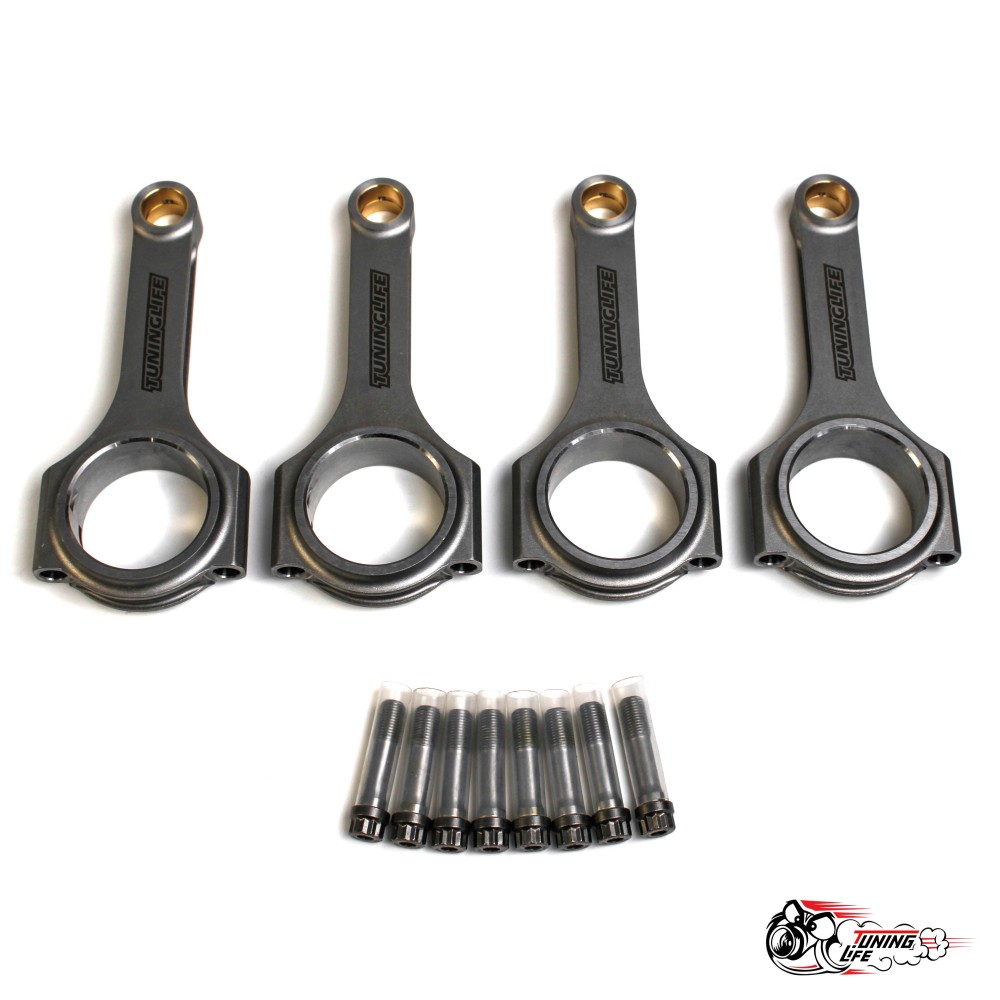 Комплект кованых Н-образных шатунов TUNING LIFE с болтами ARP 2000 с межцентровым расстоянием 133,32 мм. Верхняя головка шатуна под плавающий палец. Нижняя головка шатуна под вкладыш ВАЗ 2101. Материал изготовления: Сталь 4340 (американский стандарт) с повышенным содержанием хрома и никеля. Н-образный профиль шатуна позволяет снизить массу шатуна при сохранении высокой прочности. Дополнительная прочность достигается за счет уплотнения металла мелкой металлической дробью (дробеструйная обработка). Снижение массы шатуна уменьшает инерционные нагрузки, что положительно сказывается на работе спортивного, высокооборотистого двигателя. Шатуны комплектуются болтами высокой прочности.