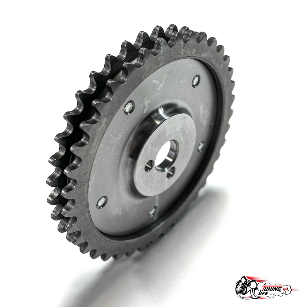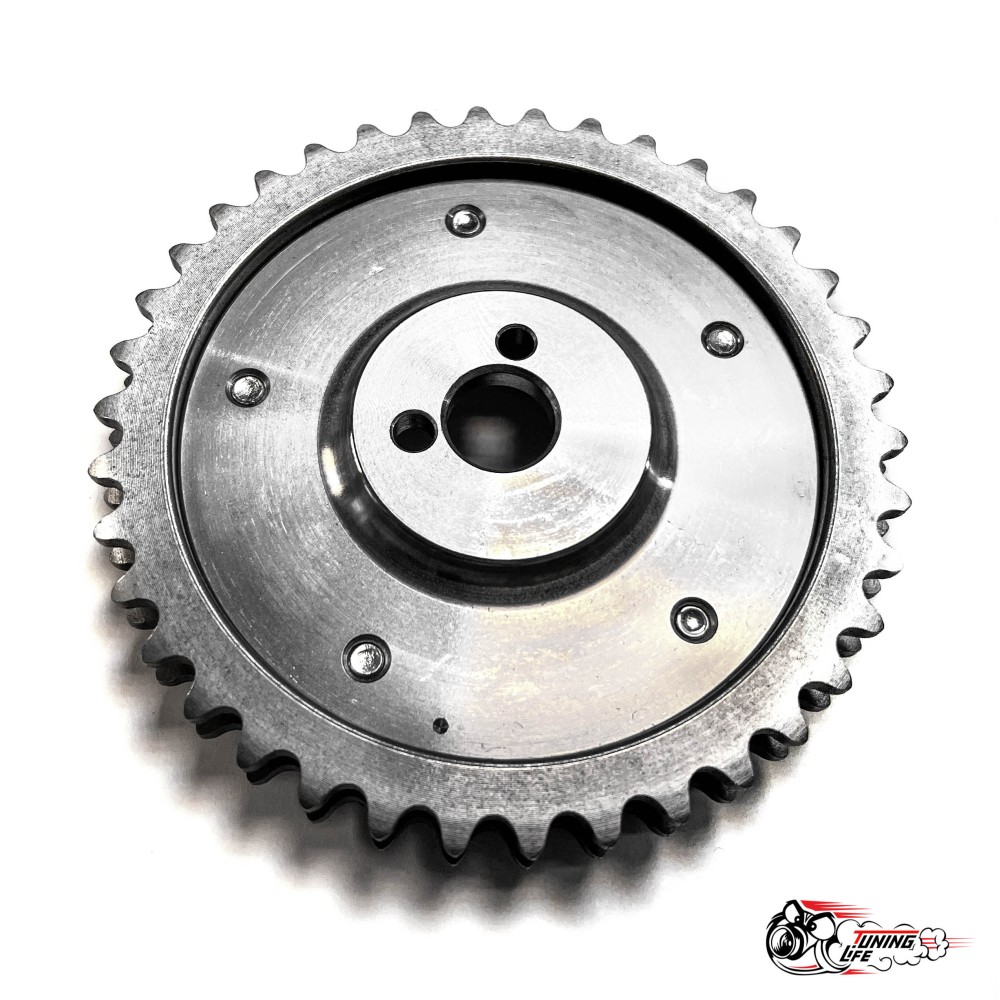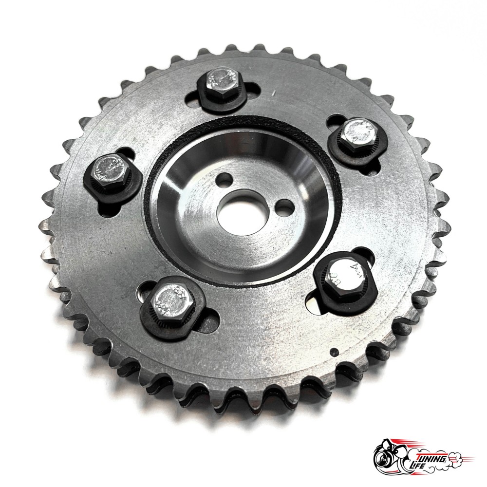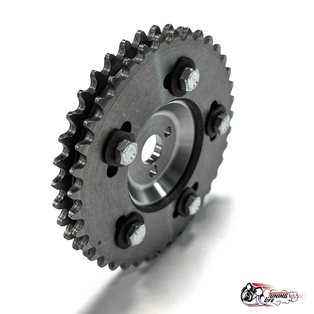 Разрезная 2-х рядная шестерня дает возможность изменить положение распредвала относительно коленвала, не ослабляя натяжения ремня ГРМ. Шаг настройки калибруется на десятые доли градуса.