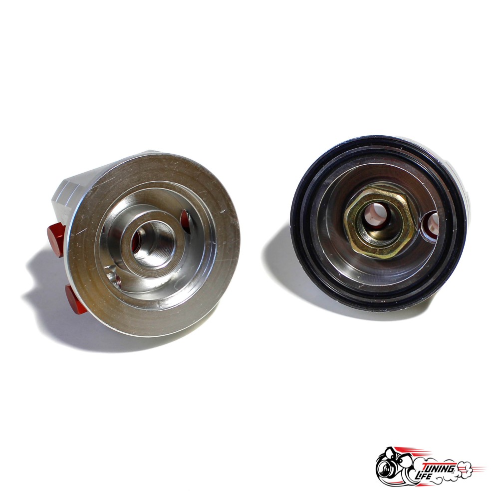Данная проставка состоит из двух половинок - одна прикручивается на блок на штатное место фильтра, при этом проставка в большинстве случаев гораздо компактнее вашего фильтра, вторая половинка при помощи шлангов устанавливается в удобном для вас месте и в нее можно установить сенсоры температуры и давления масла.