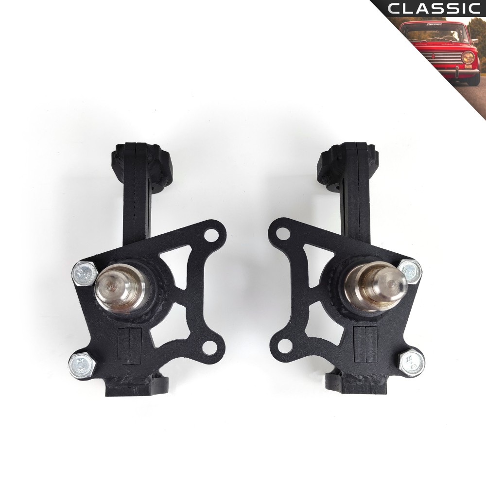 Вы можете регулировать клиренс автомобиля без изменения хода подвески, сохраняя правильную кинематику. Клиренс выставляется в трёх вариантах: -10мм, -25мм, -40мм. При этом подвеска работает правильно, нижний рычаг остается параллельно дорожному покрытию, а верхний приобретает такой угол относительно нижнего, который позволяет поменять динамический развал с положительного на отрицательный. Смещается центр крена - он становится ближе к центру тяжести, что очень положительно сказывается на рулежке автомобиля. Расстояние между шаровыми увеличено на 40мм.