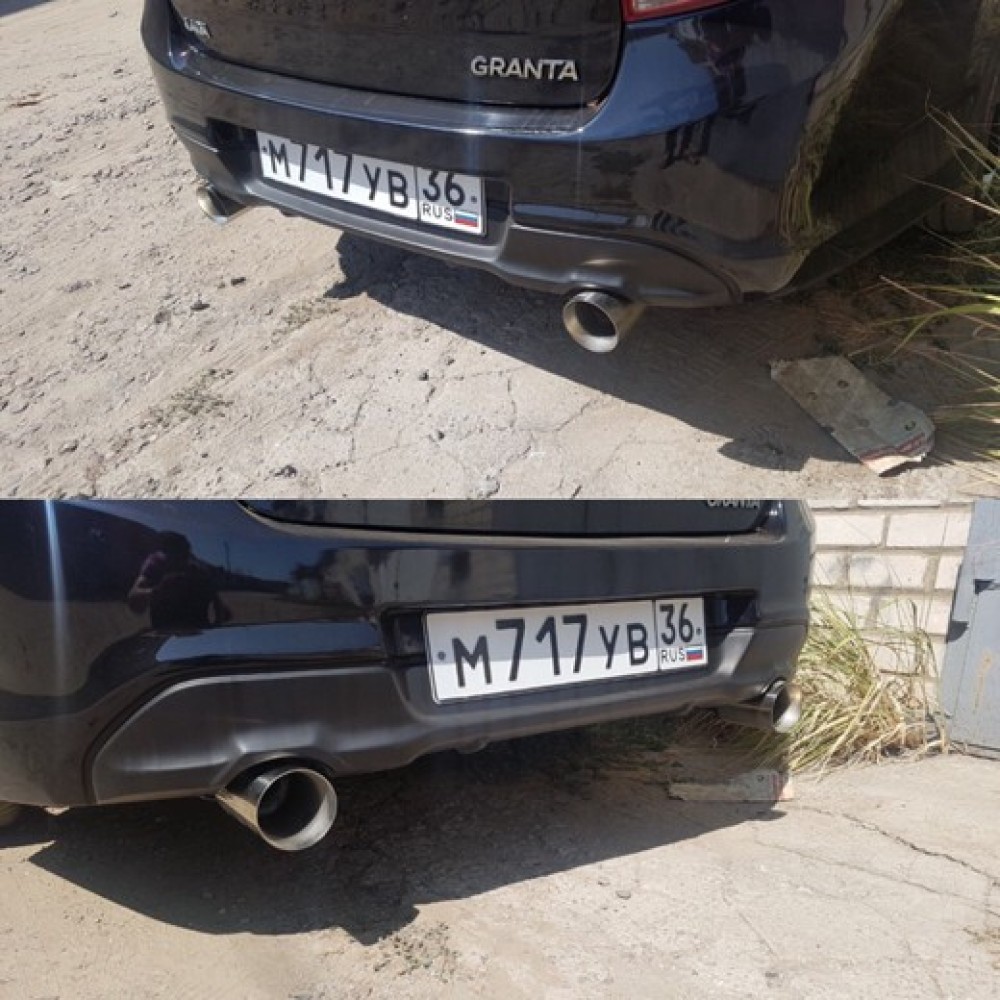 Преимущества:  товар собственного производства, установка раздвоенного глушителя на Гранту  дает прибавку мощности и придает эстетичный внешний вид. Глушитель выполнен с таким расчетом, что выхлопные газы из обоих труб выходят равномерно, конструкция прямоточная.