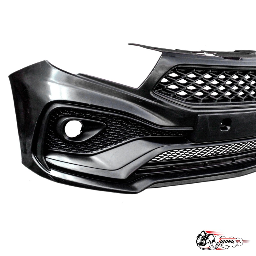 Бампер изготовлен из АБС пластика, исполнение под родные ПТФ (заглушек в комплекте нет). Некрашеный.