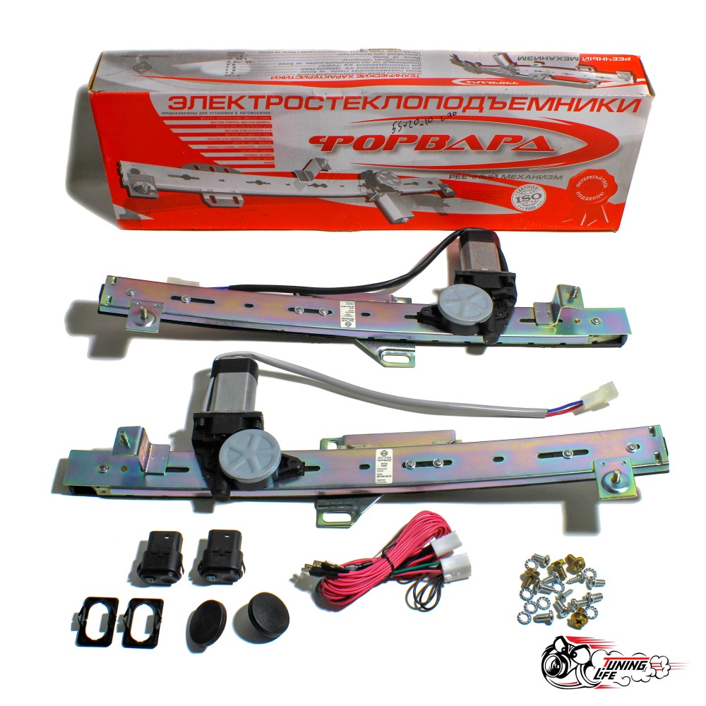 Комплект электростеклоподъемников с моторедукторами на две двери. В комплекте 2 стеклоподъемника, декоративные заглушки в отверстия от ручек механических стеклоподъемников.