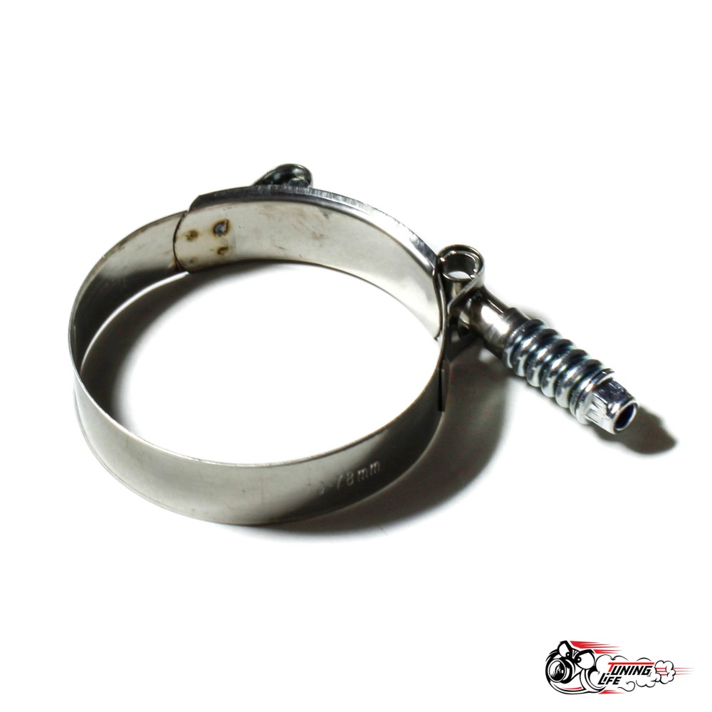 Хомут T-bolt с пружиной предназначен для надежного крепления различных шлангов в системах автомобиля. Этот силовой элемент обеспечивает прочное и долговечное соединение, что особенно важно при работе с силиконовыми и резиновыми шлангами. Диаметр хомута варьируется от 70 мм до 78 мм, что делает его универсальным решением для множества применений.